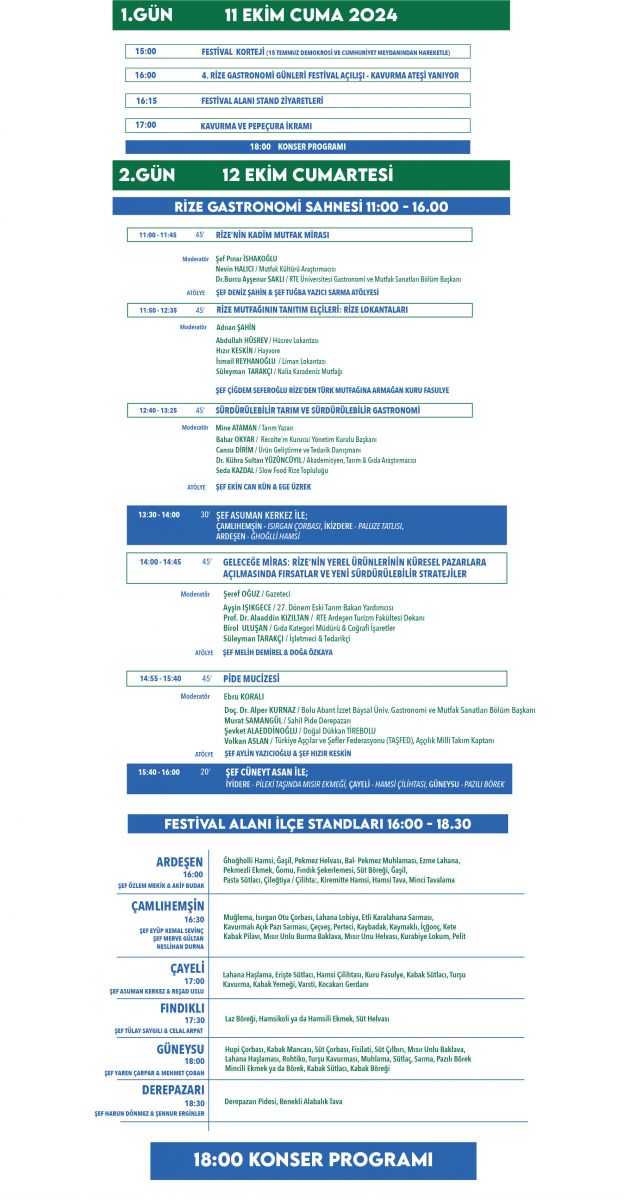 Gastronomi dünyasının ünlü isimleri de etkinlikte sahne alacak. Şef Cüneyt Asan, Asuman Kerkez ve İdilika gibi tanınmış şefler, Rize’nin mutfak kültürünü yansıtan özel lezzetleri tanıtarak katılımcılara unutulmaz bir gastronomi deneyimi yaşatacak. İyidere’den Pileki Taşında Pişen Mısır Ekmeği, Çamlıhemşin’den Isırgan Çorbası, Fındıklı’dan Süt Helvası ve Pazar’a özgü Muhlama gibi bölgenin farklı lezzetleri sahnede tanıtılacak.